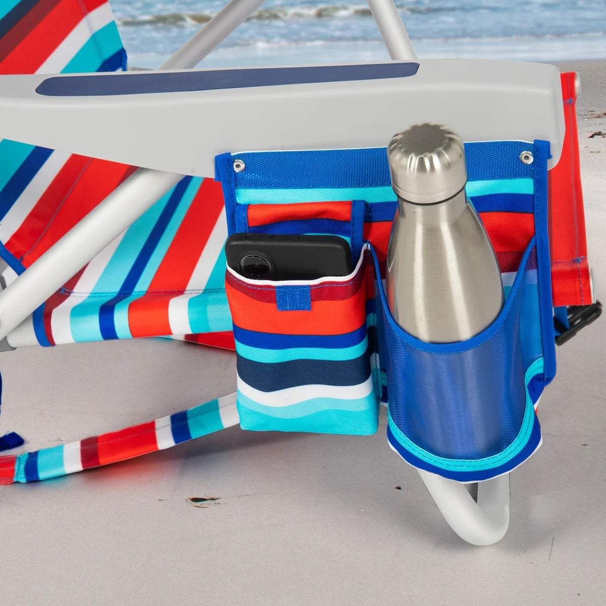 Relax like never before in this deluxe backpack beach chair! This lightweight aluminum chair will not rust and collapses for hands-free toting. When unfolded, it reclines to five different positions, and lays flat, for just the right comfort and sunning. With an insulated pouch, cell phone holder, towel bar, adjustable pillow and more, you’re guaranteed to always have the best seat in paradise!