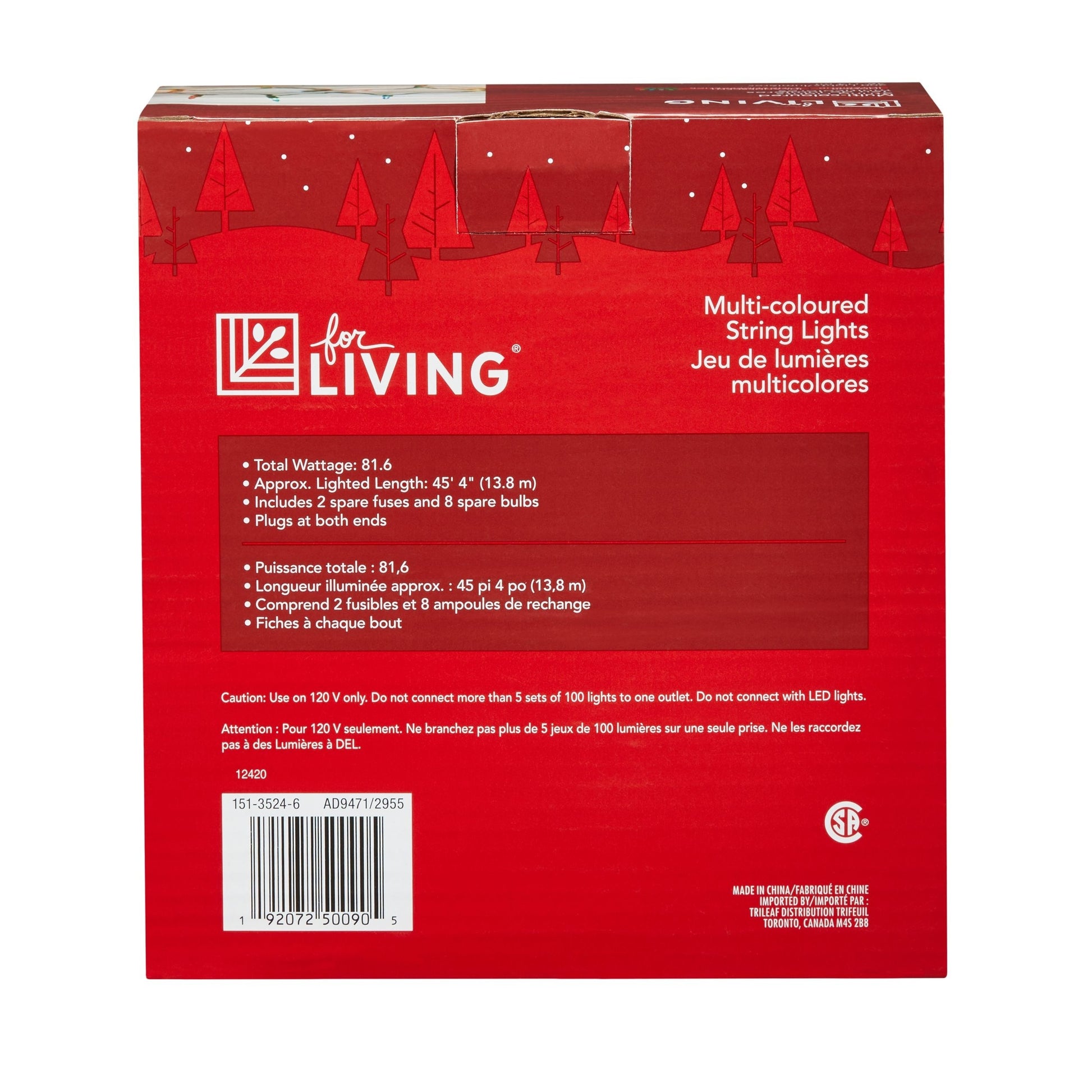 Featuring 200 lights in traditional festive colours, the For Living Indoor 200 Mini Incandescent Lights will illuminate your home and add some seasonal cheer to any space. These mini incandescent Christmas lights are designed with end-to-end connectivity, so you can connect up to two sets for greater illumination. Whether you're hanging these string lights around your home or on your tree, they are sure to add a warm holiday glow that your family and friends will love.