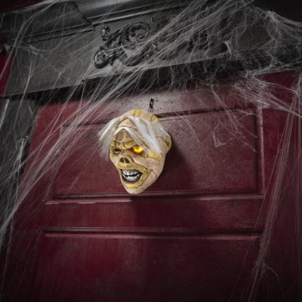 Be the hit of the Halloween party with an animated mummy head! Our creepy, decaying mummy rolls forward and speaks spooky phrases as rattling noises play. The mouth makes chomping motions and the eye flashes with yellow light. This mummy head is a must-have that makes a spooktacular Halloween gift or decorative accent.