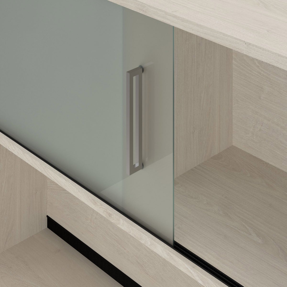 - Spacious hutch features 2 closed storage areas behind sliding frosted glass doors and 2 open storage areas with 1 fixed shelf