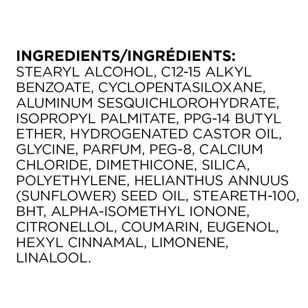 Stearyl alcohol, C12-15 alkyl benzoate, cyclopentasiloxane, aluminum sesquichlorohydrate, isopropyl palmitate, PPG-14 butyl ether, hydrogenated castor oil, glycine, parfum, PEG-8, calcium chloride, dimethicone, silica, polyethylene, helianthus annuus (sunflower) seed oil, steareth-100, BHT, alpha-isomethyl ionone, citronellol, coumarin, eugenol, hexyl cinnamal, limonene, linalool