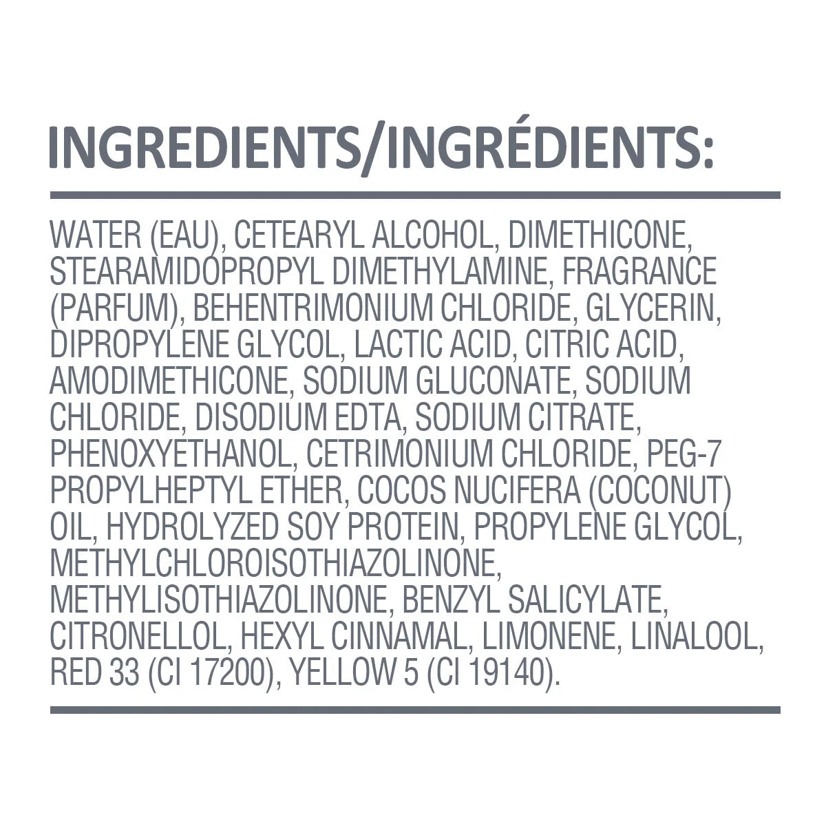 Water (eau), cetearyl alcohol, dimethicone, stearamidopropyl dimethylamine, fragrance (parfum), behentrimonium chloride, glycerin, dipropylene glycol, lactic acid, citric acid, amodimethicone, sodium gluconate, sodium chloride, disodium EDTA, sodium citrate, phenoxyethanol, cetrimonium chloride, PEG-7 propylheptyl ether, cocos nucifera (coconut) oil, hydrolyzed soy protein, propylene glycol, methylchloroisothiazolinone, methylisothiazolinone, benzyl salicylate, citronellol, hexyl cinnamal, limonene, linalool, red 33 (CI 17200), yellow 5 (CI 19140)