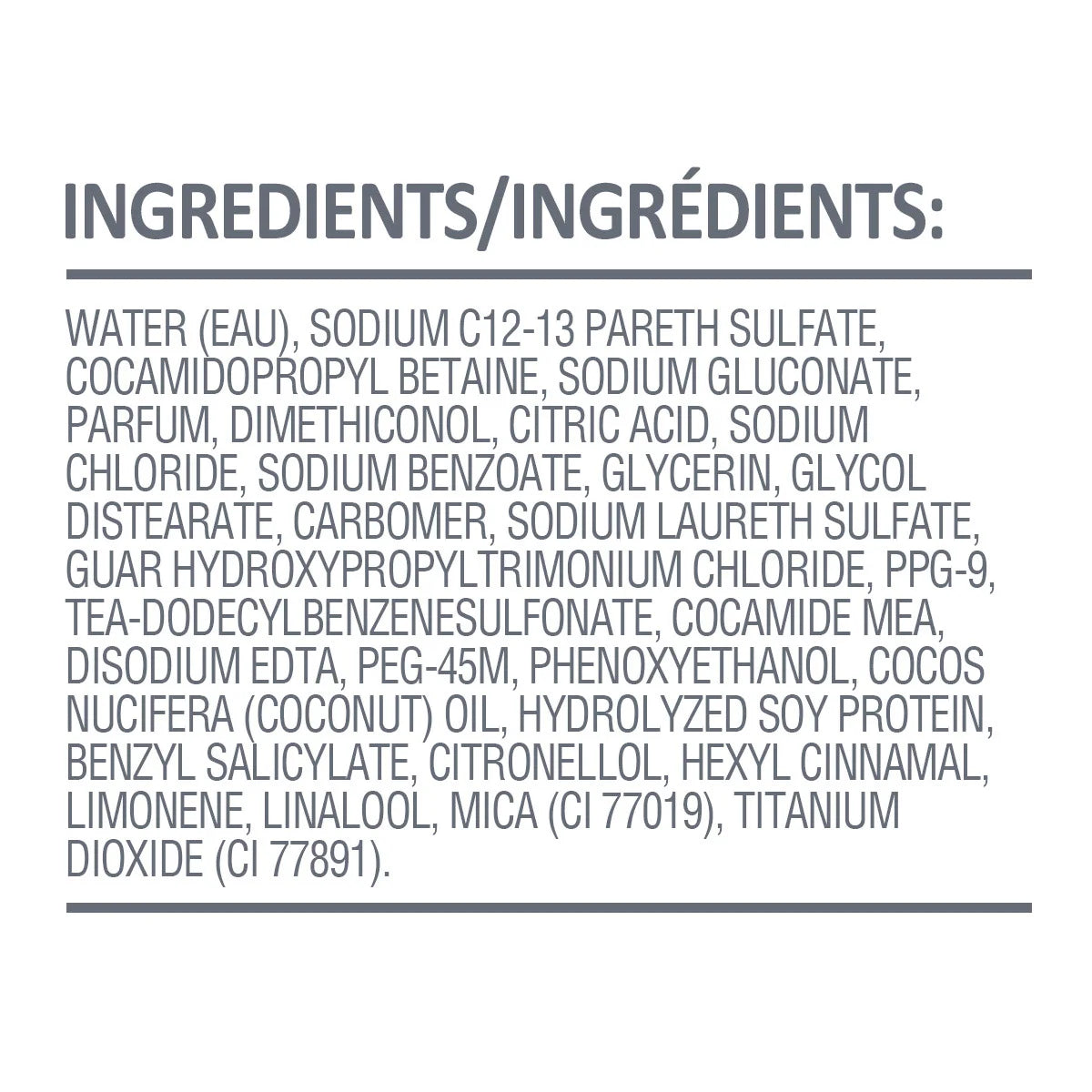 Water (eau), sodium C12-13 pareth sulfate, cocamidopropyl betaine, sodium gluconate, parfum, dimethiconol, citric acid, sodium chloride, sodium benzoate, glycerin, glycol distearate, carbomer, sodium laureth sulfate, guar hydroxypropyltrimonium chloride, PPG-9, TEA-dodecylbenzenesulfonate, cocamide MEA, disodium EDTA, PEG-45M, phenoxyethanol, cocos nucifera (coconut) oil, hydrolyzed soy protein, benzyl salicylate, citronellol, hexyl cinnamal, limonene, linalool, mica (CI 77019), titanium dioxide (CI 77891)
