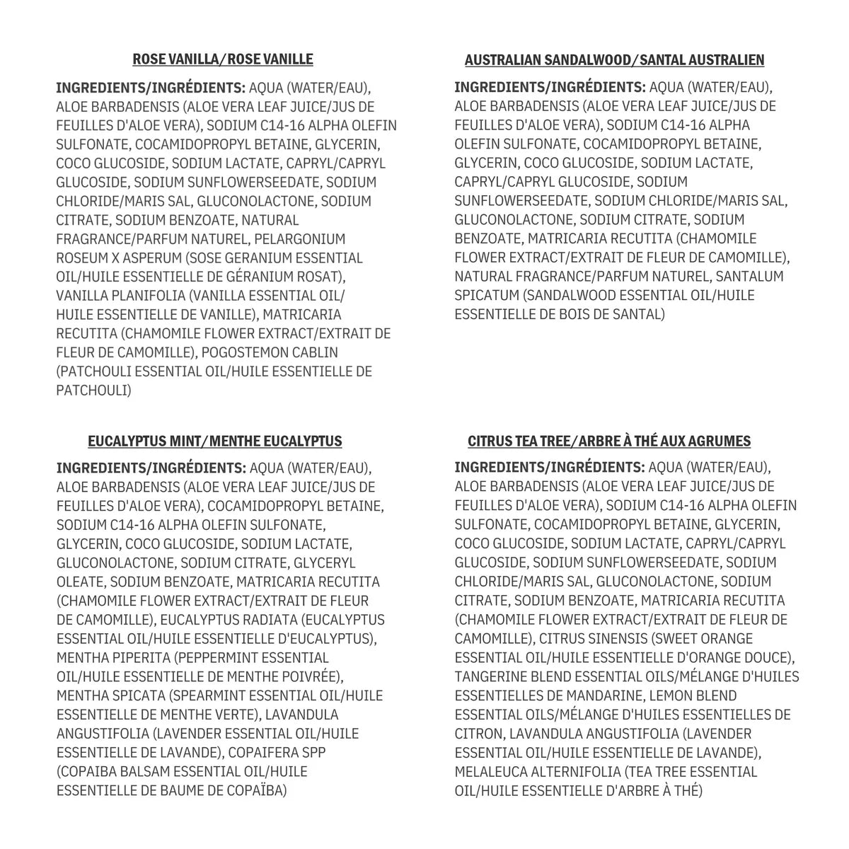 Aqua (water/eau), aloe barbadensis (aloe vera aloe leaf juice/jus de feuilles d'aloe vera), sodium C14-16 alpha olefin sulfonate, cocamidopropyl betaine, glycerin, coco glucoside, sodium lactate, capryl/capryl glucoside, sodium sunflowerseedate, sodium chloride/maris sal, gluconolactone, sodium citrate, sodium benzoate, natural fragrance/parfum naturel, pelargonium roseum X asperum (rose geranium essential oil/huile essentielle de géranium rosat), vanilla planifolia (vanilla essential oil/ huile essentielle de vanille), matricaria recutita (chamomile flower extract/extrait de fleur de camomille), pogostemon cablin (patchouli essential oil/huile essentielle de patchouli)