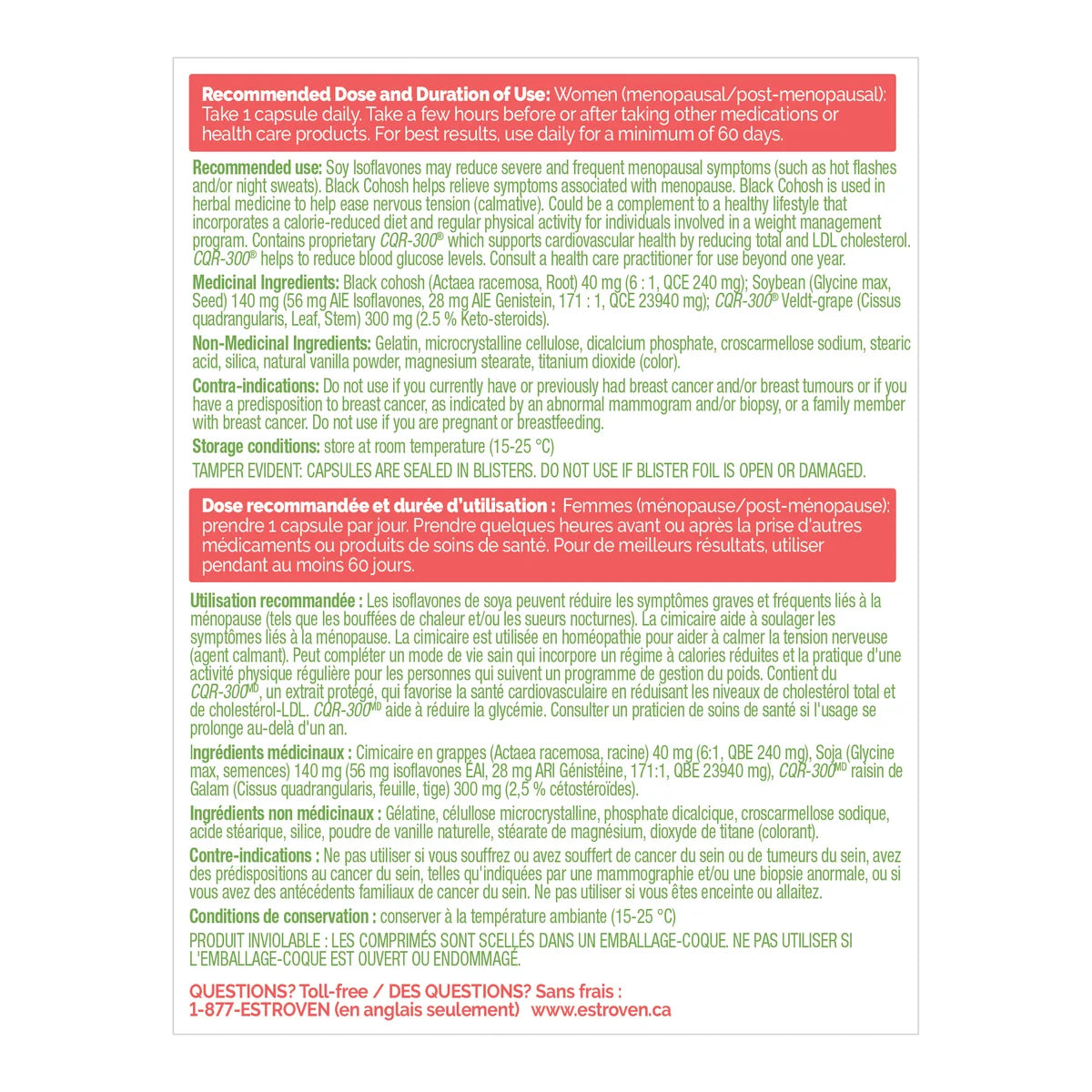 Estroven Weight Management is a natural health product containing black cohosh, soy isoflavones, and Synetrim CQ. This combination may help reduce frequency and severity of menopausal symptoms, such as hot flashes and night sweats, while also supporting cardiovascular health.
