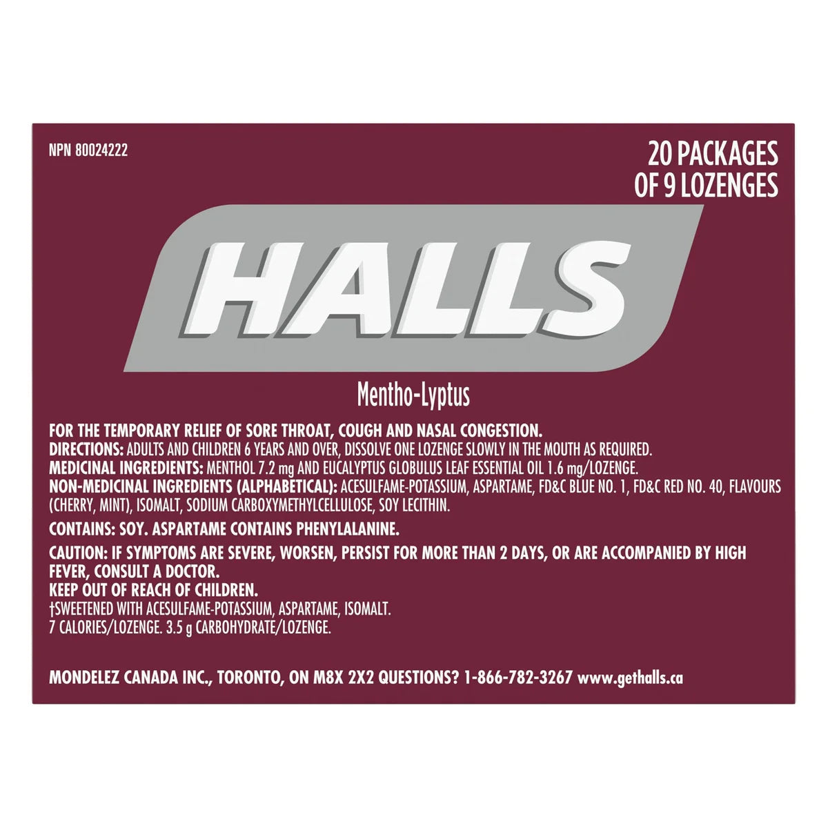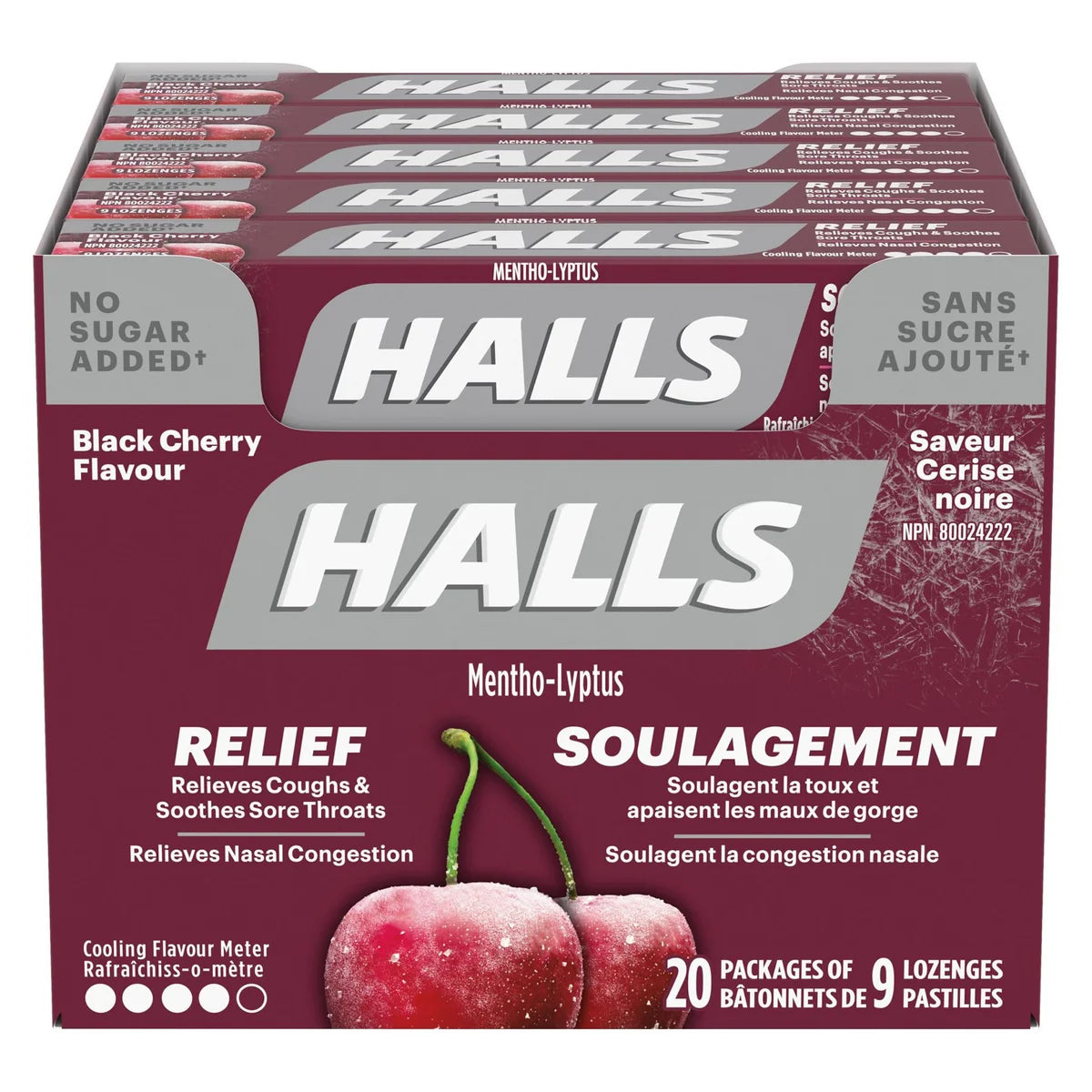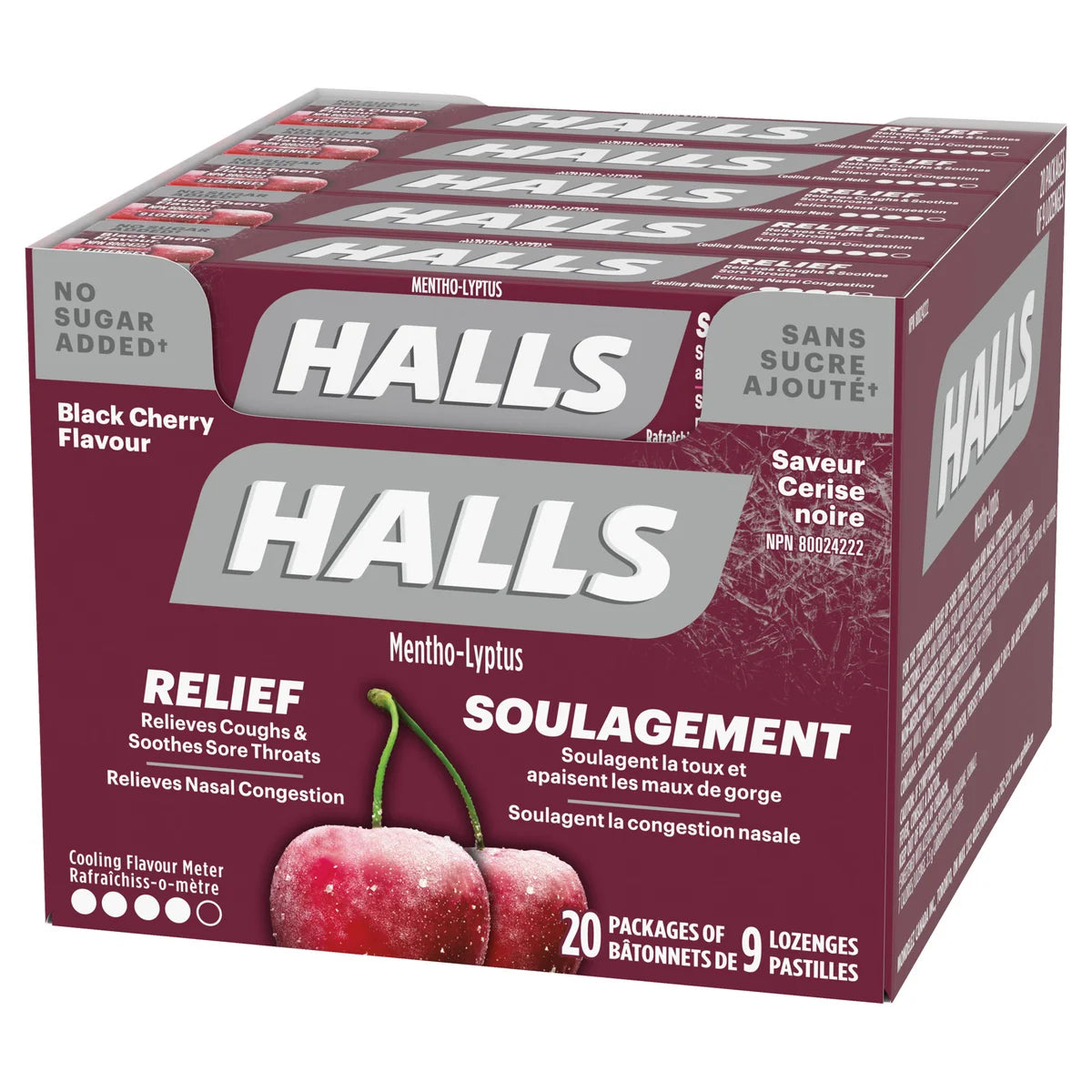 Halls Black Cherry Flavour With No Sugar Added Cough Drops, 20 × 9 lozenges