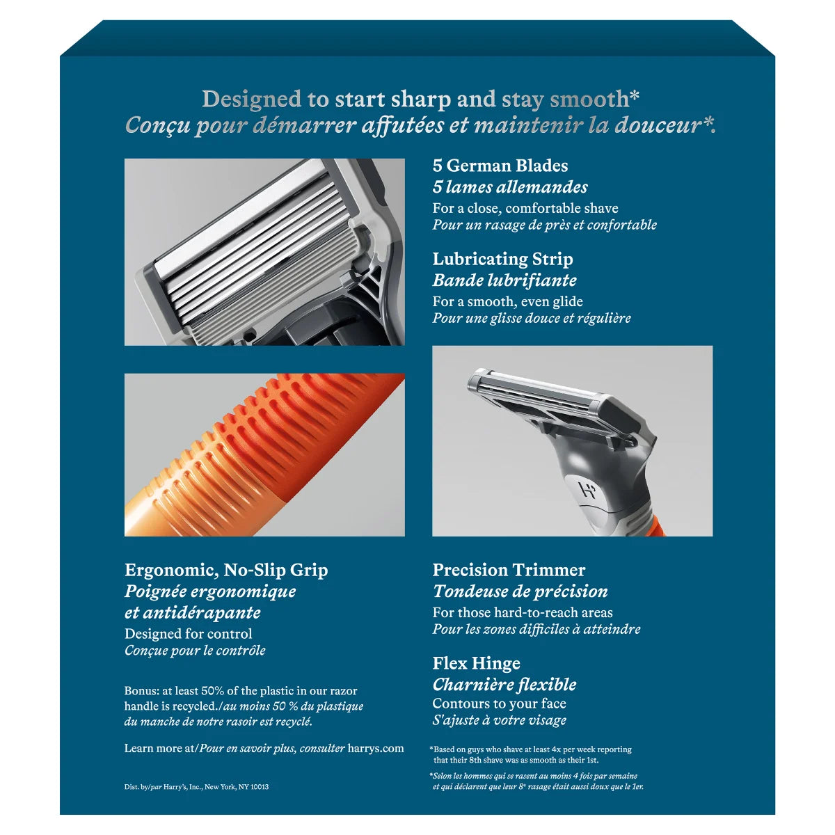 Razor blade refills feature a flex hinge that contours to your face, a precision trimmer for styling facial hair, and a lubricating strip for a smooth shave; Harry’s men’s razors each have five sharp, German-engineered razor blades; The pack includes 1 Ember orange razor handle, 5 razor blade refills and 1 Travel Blade Cover; Harry’s two-tone men’s razor handle has improved ergonomics (vs. previous Harry’s handle design), a rubberized no-slip grip, a weighted core for optimal control and made from at least 50% recycled plastic; Harry’s razor cartridges are designed for men’s shaving needs.