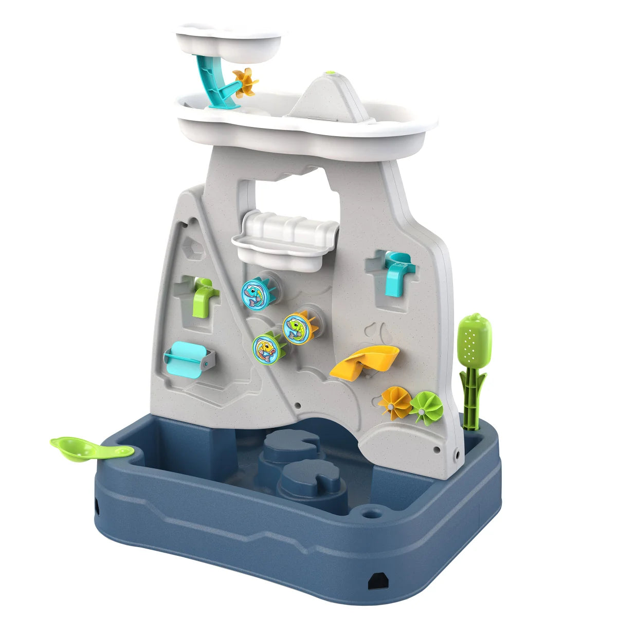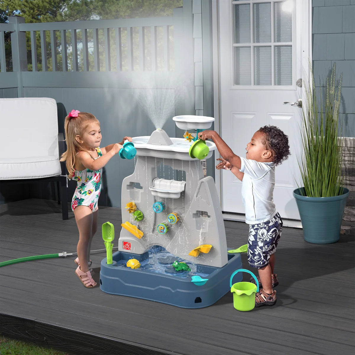 This innovative play table easily transforms from a ground-level basin to an elevated platform. Connect a standard garden hose to create a mesmerizing mountain-top misting fountain that transforms the entire play experience. Kids will love scooping, splashing, and exploring the different features of the water toy as the mist dances around them.