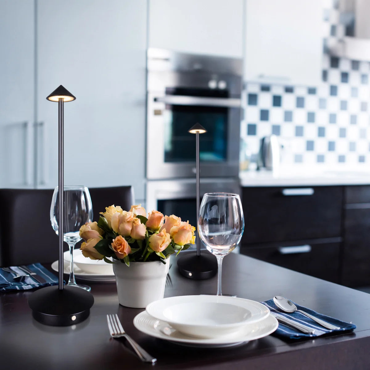 Bring style and illumination to both indoor and outdoor spaces with this pair of sleek, rechargeable table lamps. Touch switch controls on/off and brightness level. Metal construction features elegant design with arrow-shaped head that directs light onto the surface. Great for bars, restaurants, patios, office, kitchens and more.
