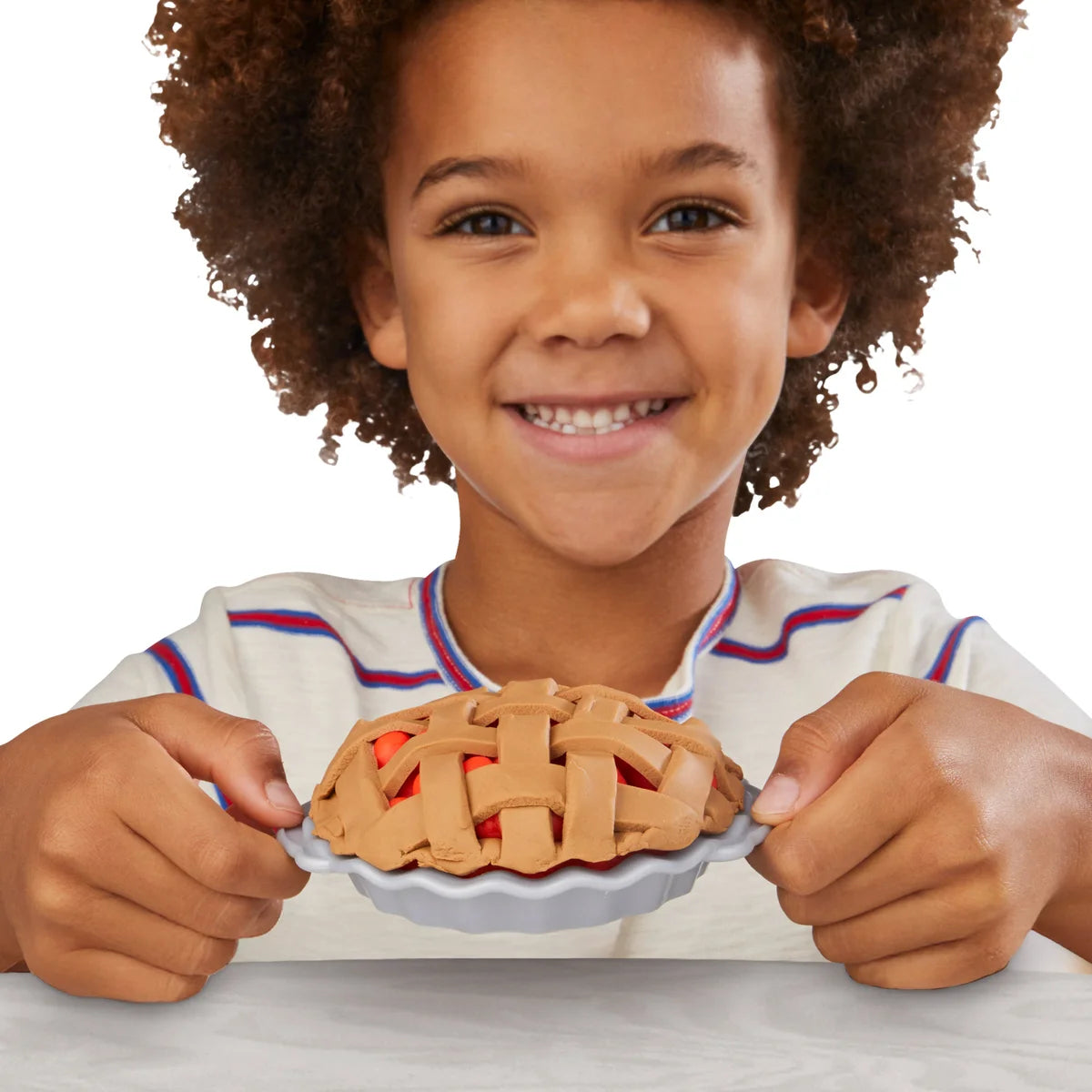 Includes bread mold, berry basket, egg carton, juice carton with rail, pizza paddle, lemon mold, pie pan, ice pop mold with stick, 12 play food stampers, 2 cups, 2 cones, 2 plates, 2 cutters, scissors, roller, serving tool, bowl, knife, fork, 2 spoons, and 10 cans of Play-Doh Brand Modeling Compound (total 1 lb 14 oz/850 g)