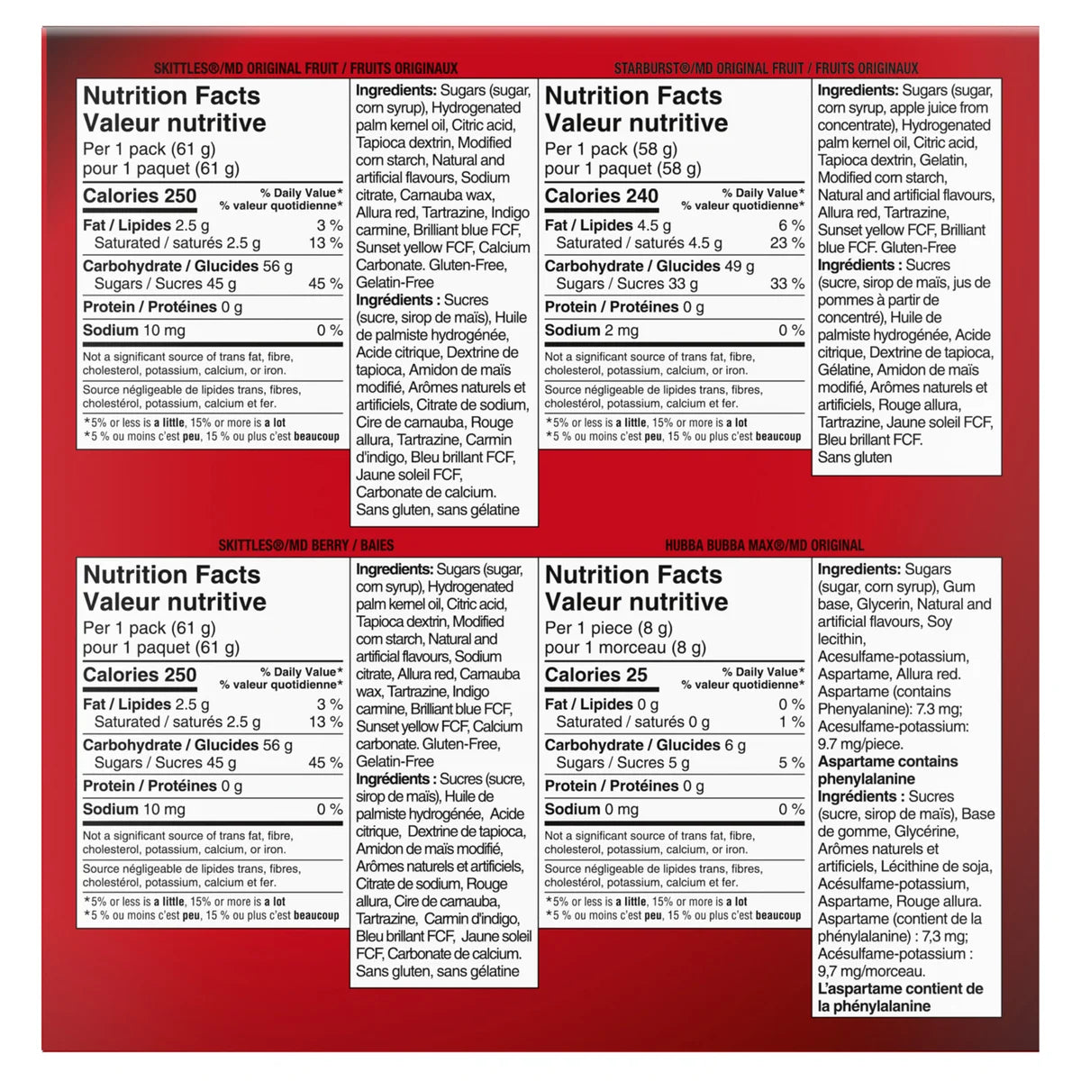 Skittles: this bite size fruity chewy candy are deliciously sweet and fruity, perfect for filling the candy bowl at work, party favours or decorating baked goods. Starburst: enjoy the classic fruit flavours you love: orange, lemon, strawberry, cherry.