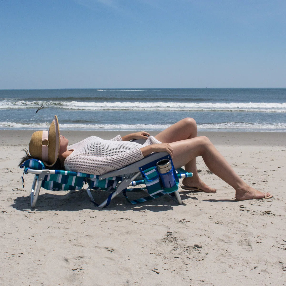 Relax like never before in this deluxe backpack beach chair! This lightweight aluminum chair will not rust and collapses for hands-free toting. When unfolded, it reclines to five different positions, and lays flat, for just the right comfort and sunning. With an insulated pouch, cell phone holder, towel bar, adjustable pillow and more, you’re guaranteed to always have the best seat in paradise!