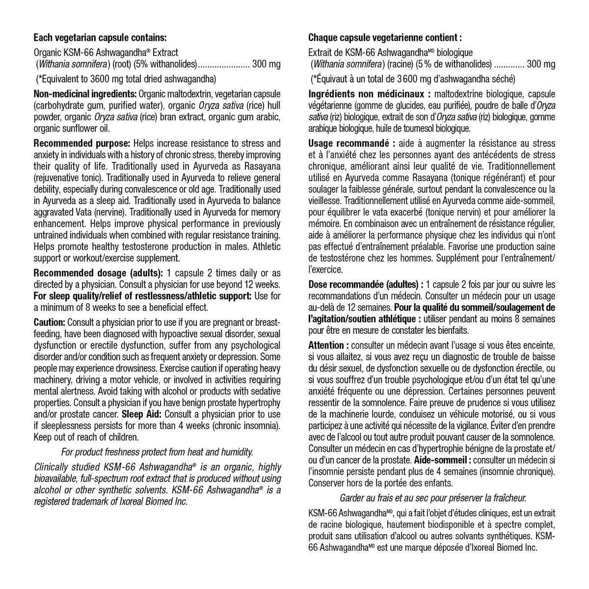 - Each vegetarian capsule provides 300 mg of organic ashwagandha root extract, equivalent to 3600 mg of dried ashwagandha, standardized to 5% withanolides