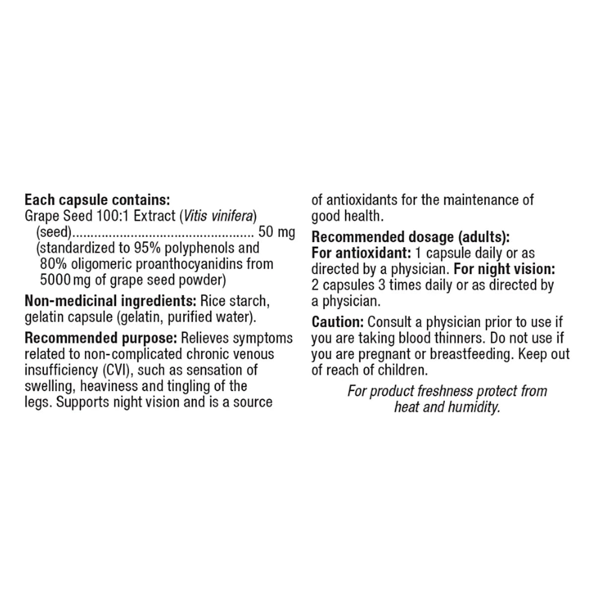 Webber Naturals Extra Strength Grape Seed 100:1 Extract provides 100 mg of grape seed extract per capsule, standardized to 95% polyphenols and 80% oligomeric proanthocyanidins. This supplement helps relieve symptoms of chronic venous insufficiency (CVI) such as swelling, heaviness, and tingling in the legs, and supports night vision. A powerful source of antioxidants, it is non-GMO, vegan, and free from artificial additives. Take 2–4 capsules daily for a minimum of 1 month. NPN: 80021265.