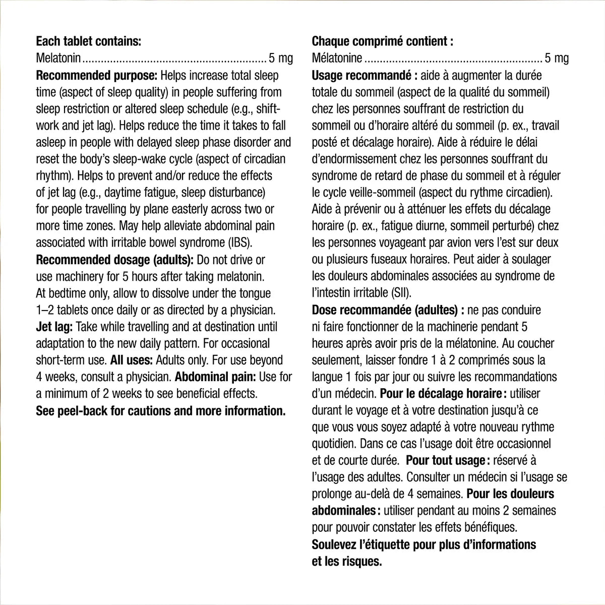 - 5 mg of melatonin per fast-dissolving sublingual tablet