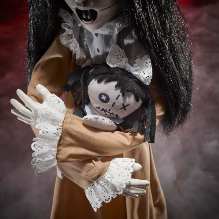 Kick up the fright factor with this animated creepy girl who's lost her head! This ghoulish gal makes terrifying noises from the beyond as her head abrubtly detaches at the jaw and pops up. Wearing a distressed brown gown with lace accents, our animated possessed girl holds a rag doll. She makes a perfectly appalling addition to your indoor Halloween decorations or haunted house. Collapses for easy storage.